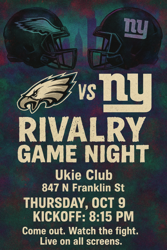 THIS THURSDAY NIGHT — OCTOBER 9TH, 8:15 PM! Join us at the Ukie Club Members Bar as the Philadelphia Eagles look for Revenge vs. the G-Men!