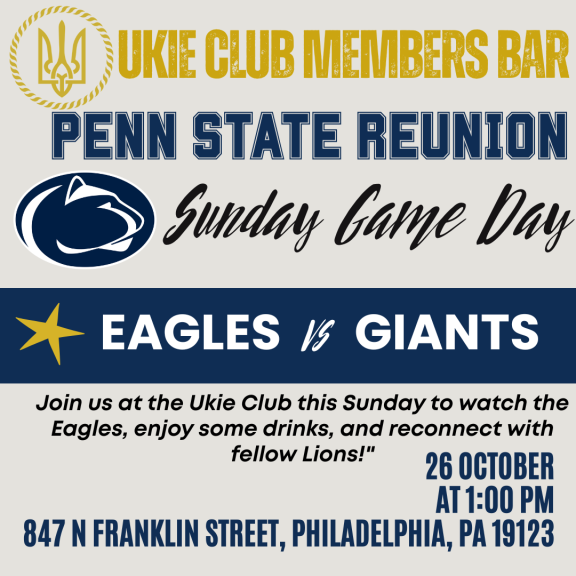 Penn State Alums – it's time to reunite, reconnect, and rally behind the Birds! Join us for a special Penn State Alumni Watch Party at the Ukie Club Members Bar on Sunday, October 26th, as the Eagles take on the Giants at 1PM.