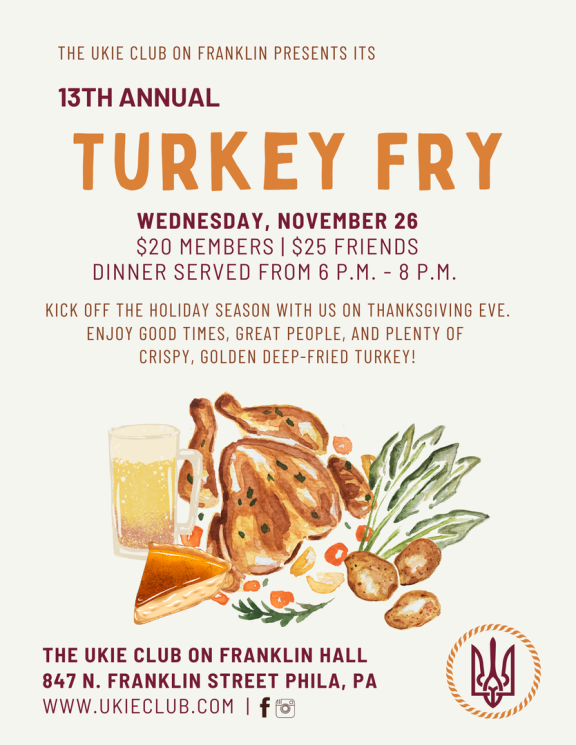 It’s that time of year again! Kick off the Thanksgiving holiday with us on Wednesday, November 26 at the Ukie Club on Franklin’s Hall for an evening of great company, festive fun, and a feast of mouthwatering, house-made deep-fried turkeys with all the sides and desserts you love.