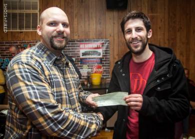 UACA Vice President Steve Zdorow presented a $100 donation to Mason Wartman owner of Rosa's Fresh Pizza, a local pizzeria tha toffers one slice of pizza at no cost to walk-in members of the Philadelphia's homeless population at BigBite Philly's 6th Annual Philly Chili Bowl on March 14, 2015.